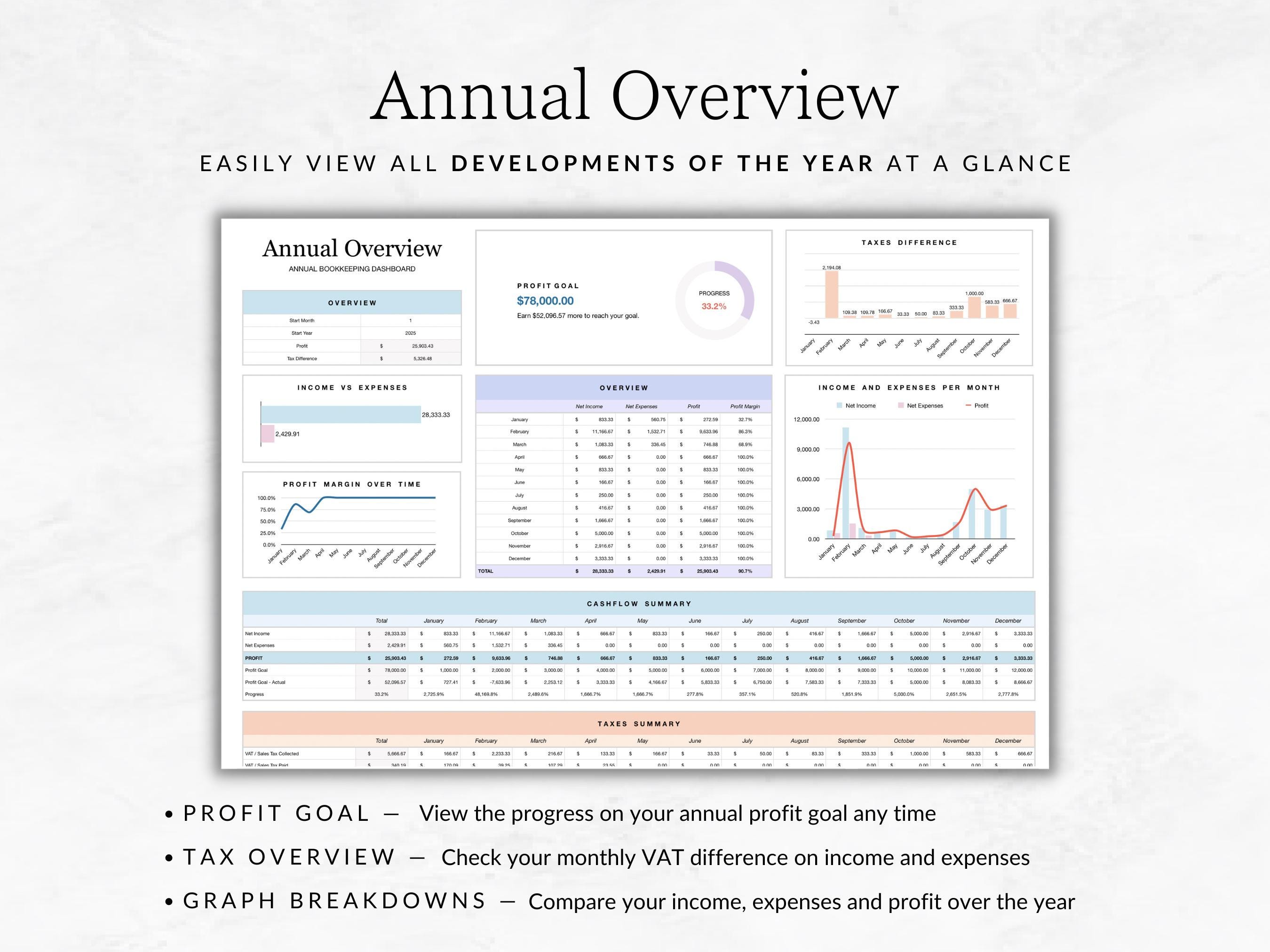 This budget spreadsheet gives you a better overview of your small business finances. The automated monthly and annual overviews make your business bookkeeping easier and help you prepare your income statement.