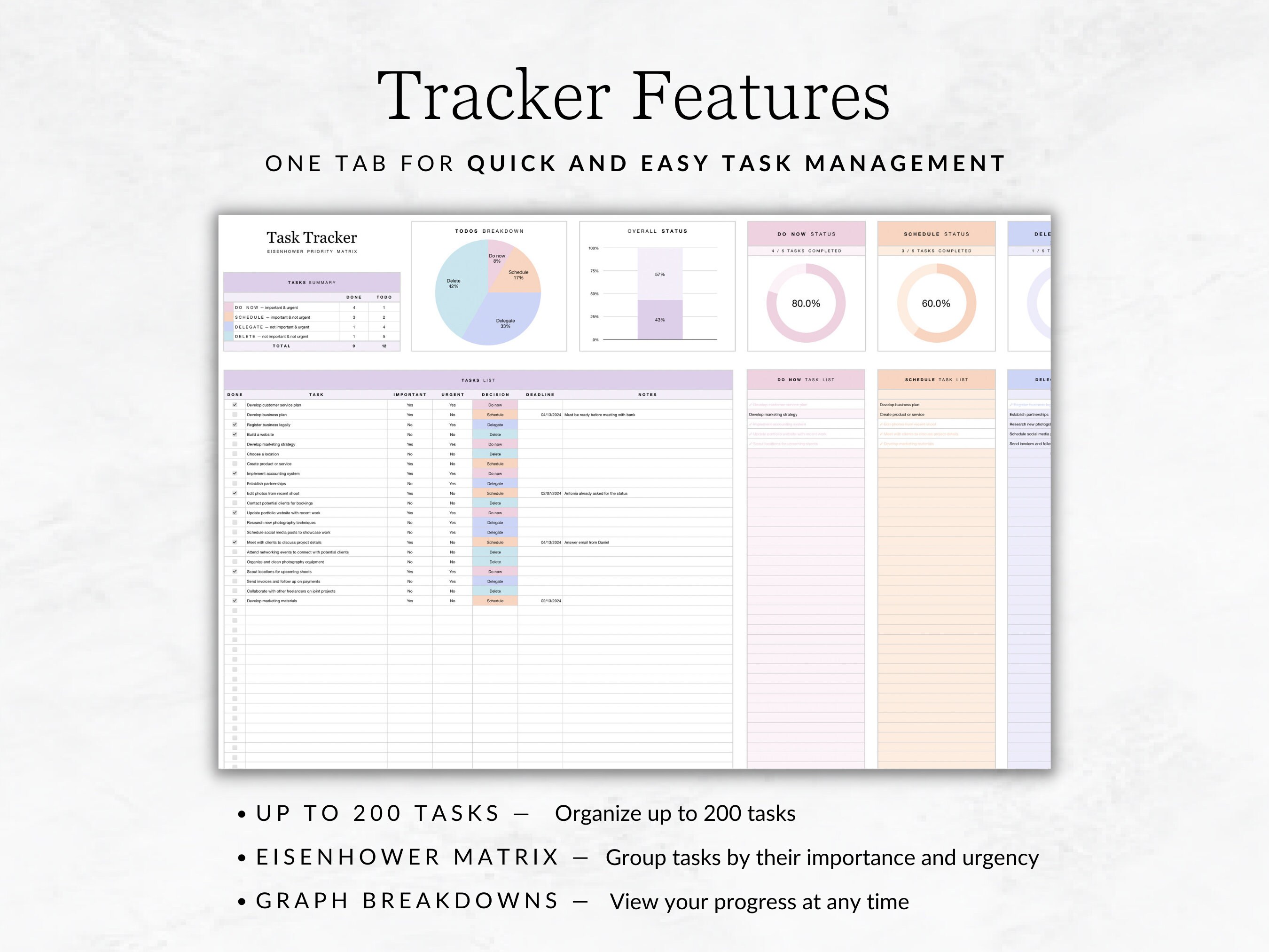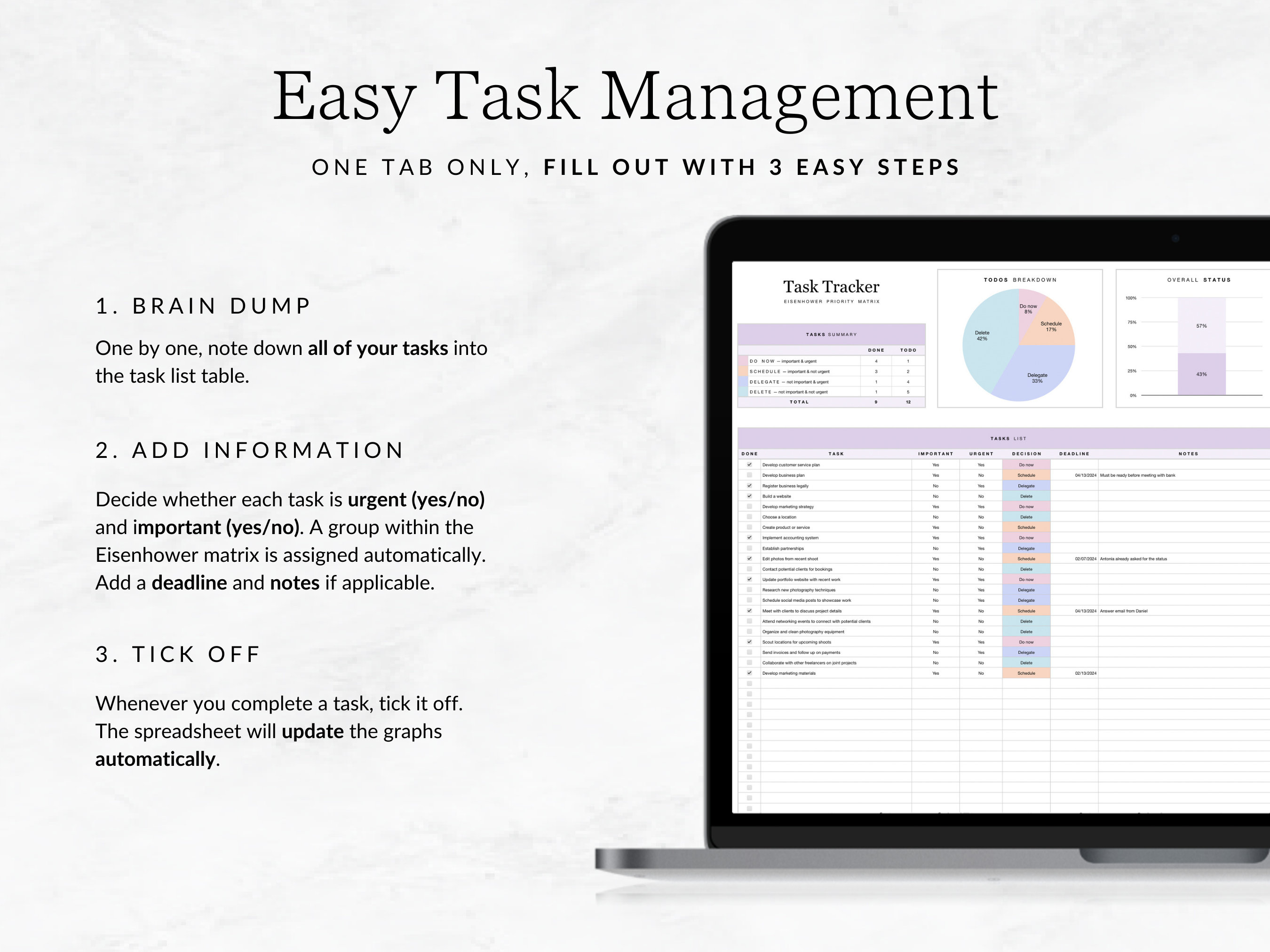 This tracker gives you a better overview of your upcoming tasks. The automatic classification via the Eisenhower Matrix makes your time management easier and helps you to work through your to-dos efficiently.