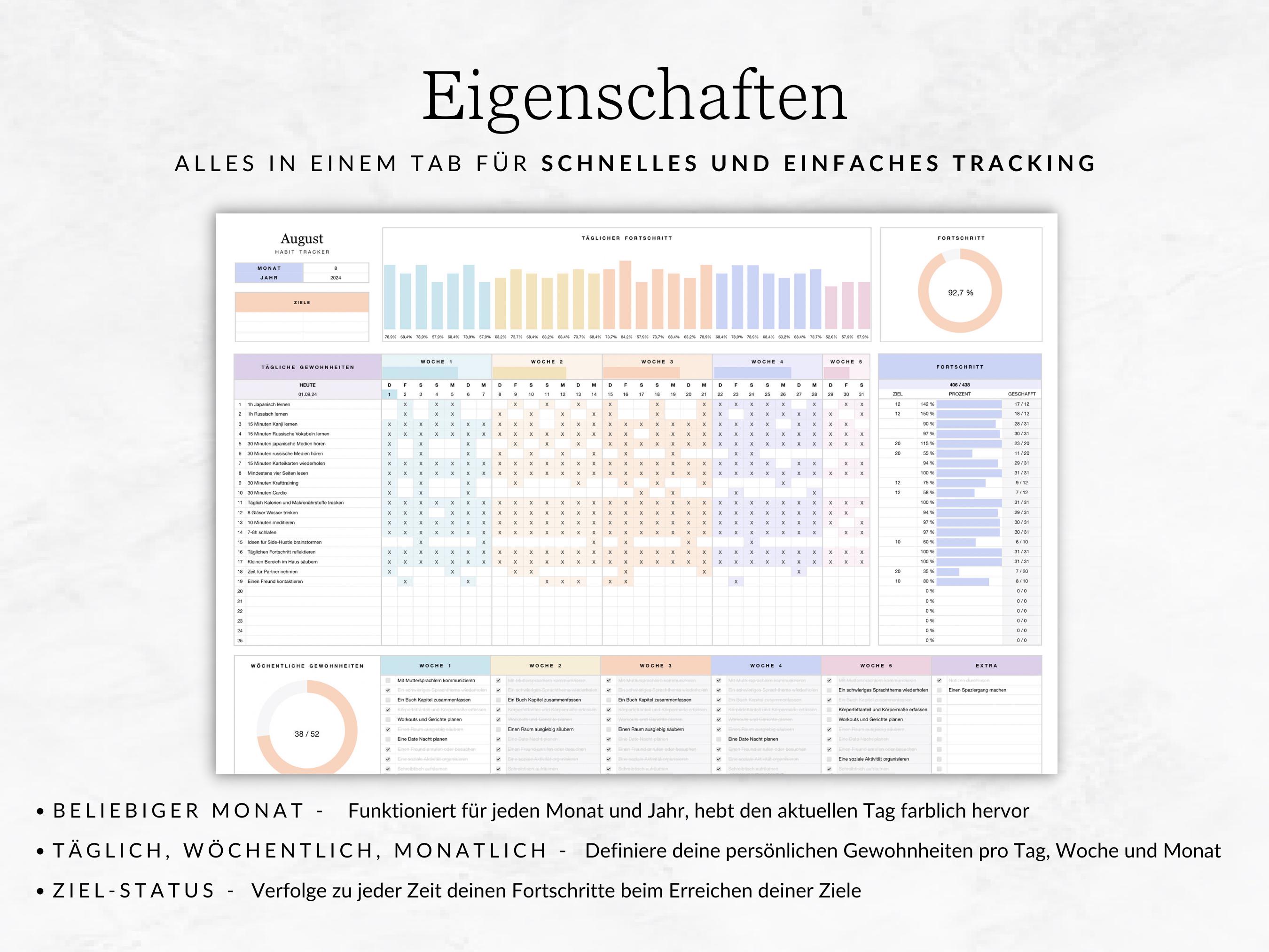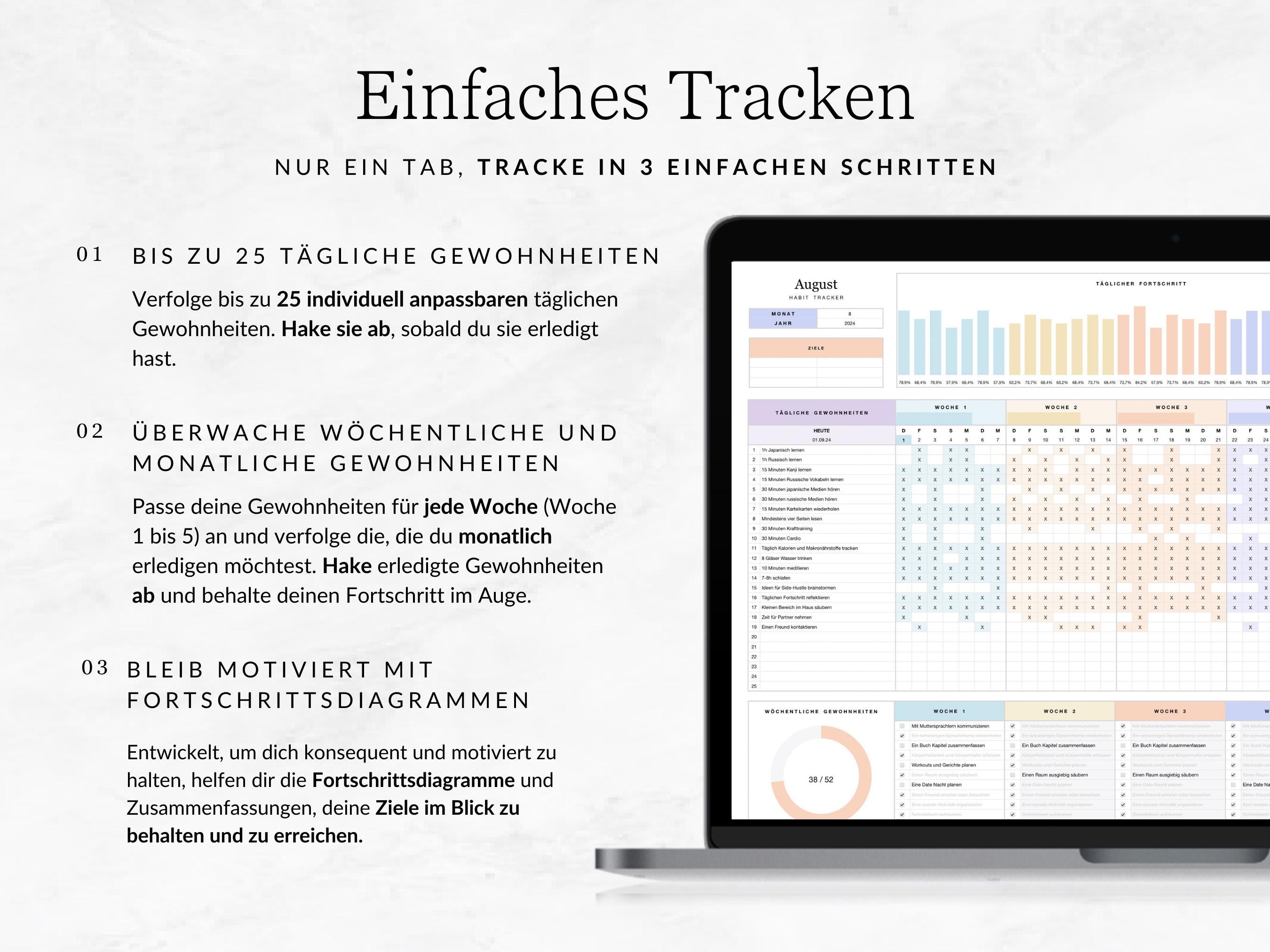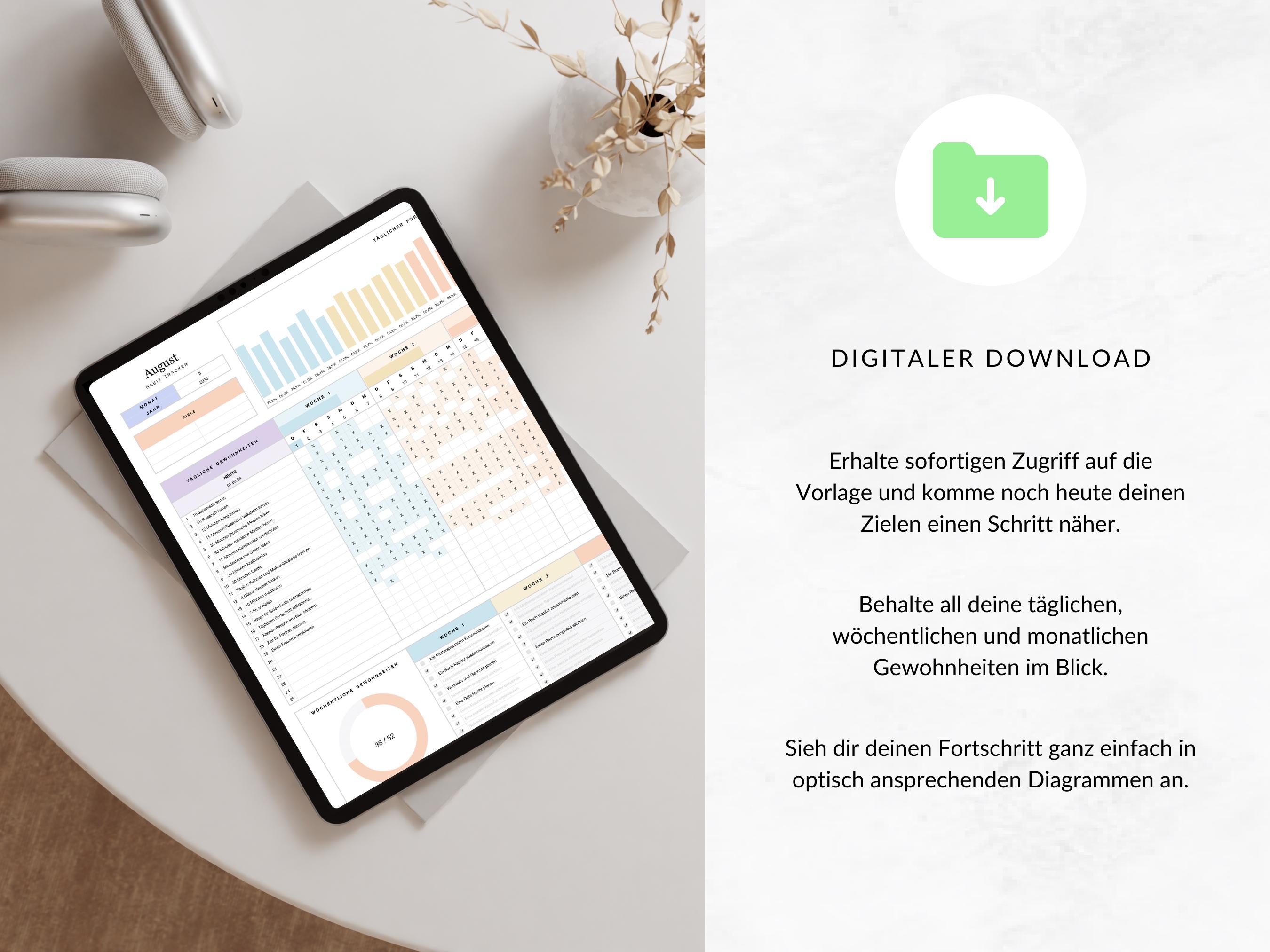 This template gives you a better overview of your existing daily, weekly and monthly habits and the ones you want to establish. The automatic visualization makes it easy to track your progress and helps you working towards your long-term goals.