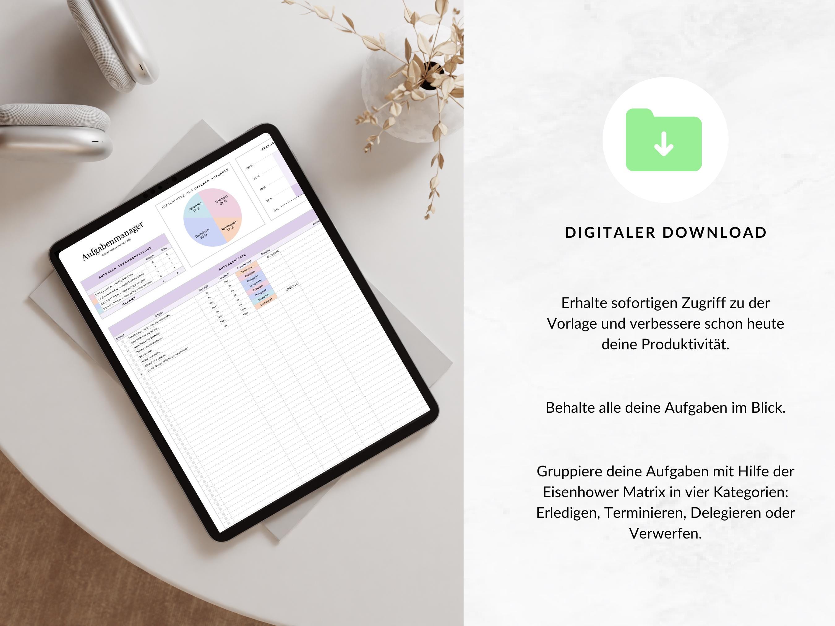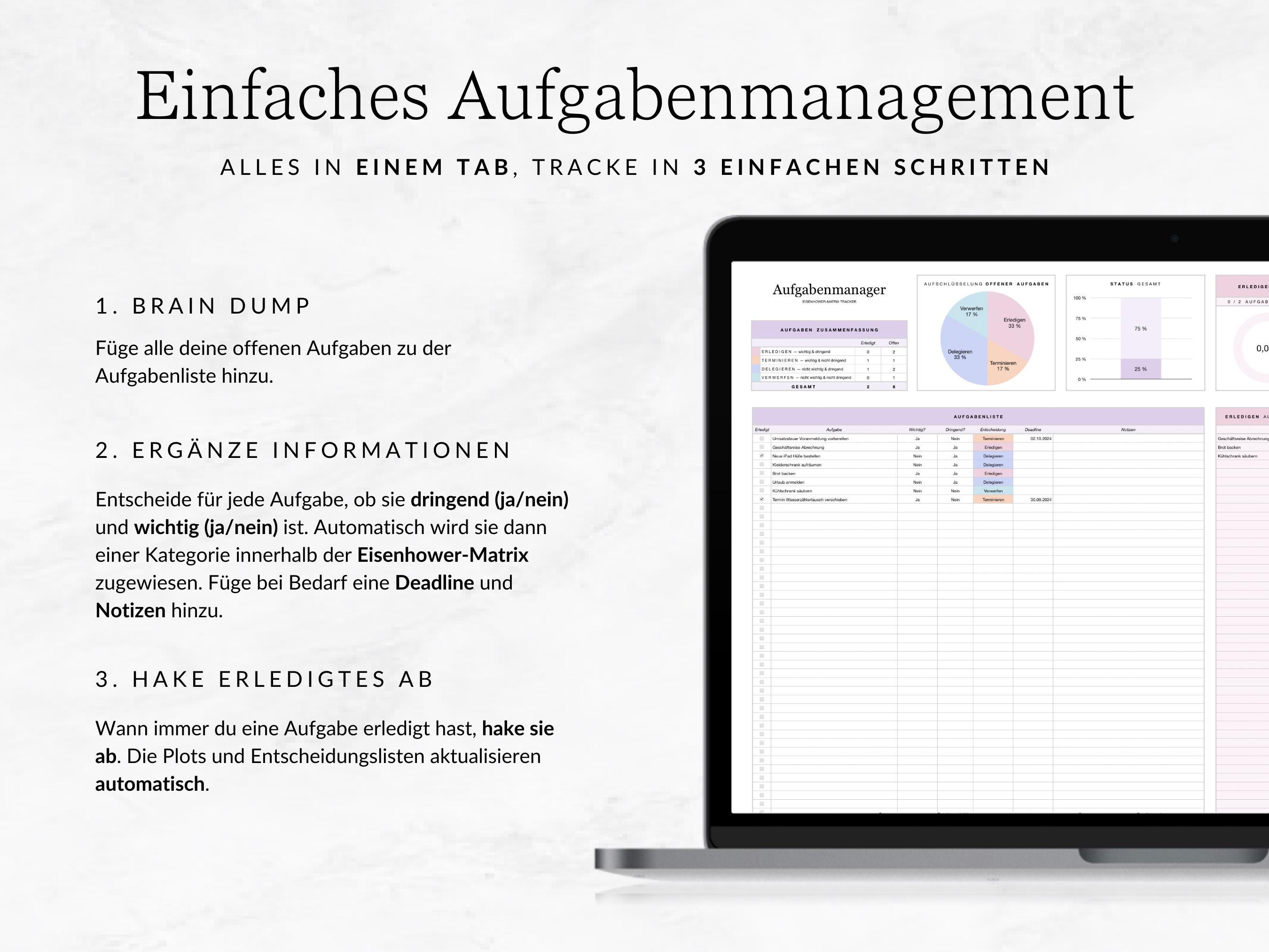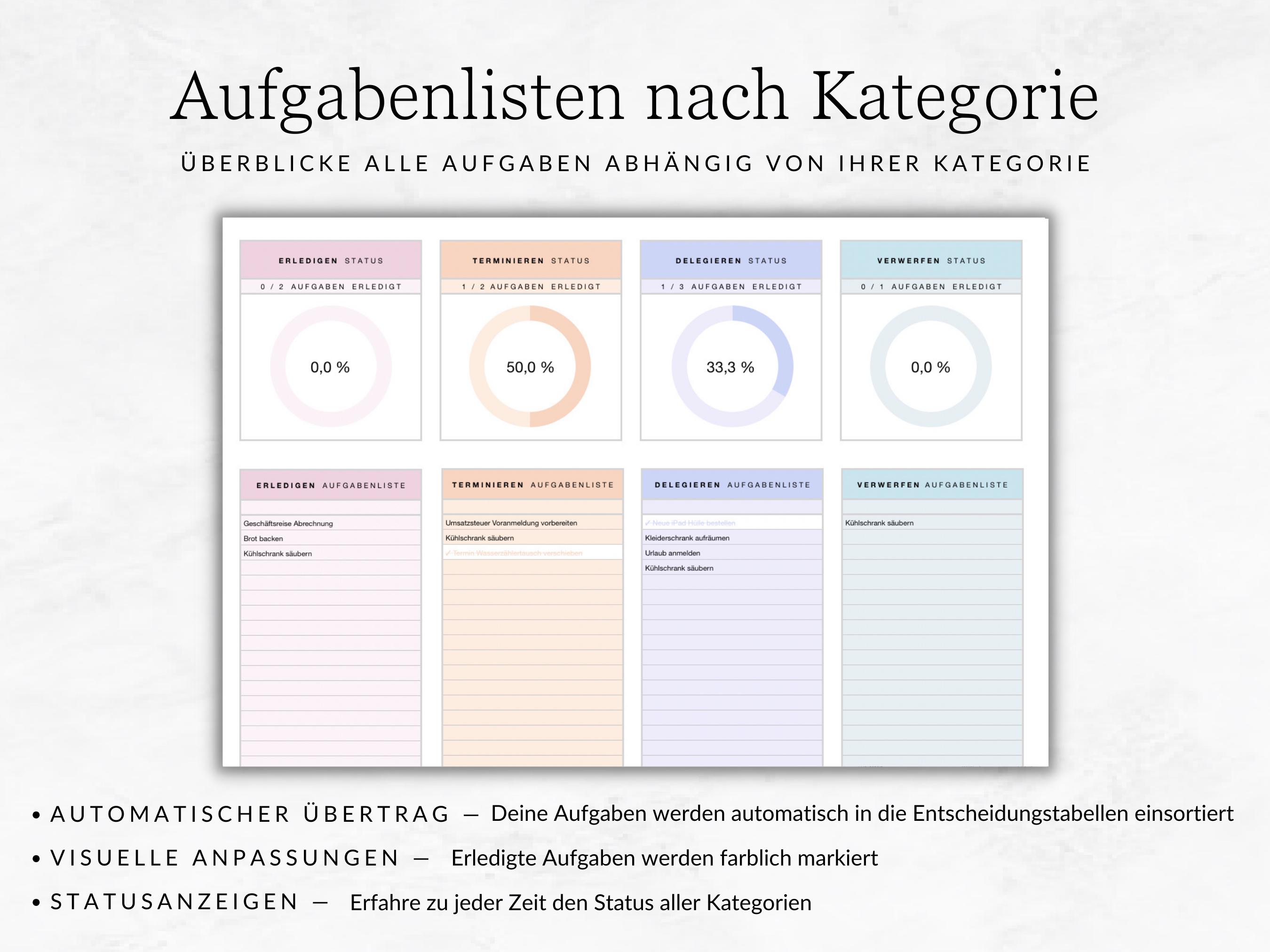 This tracker gives you a better overview of your upcoming tasks. The automatic classification via the Eisenhower Matrix makes your time management easier and helps you to work through your to-dos efficiently.