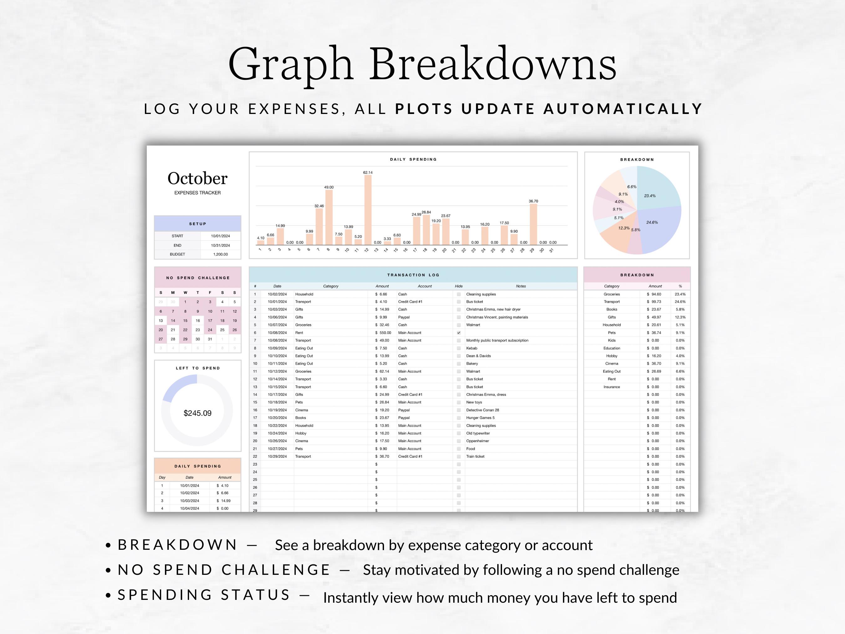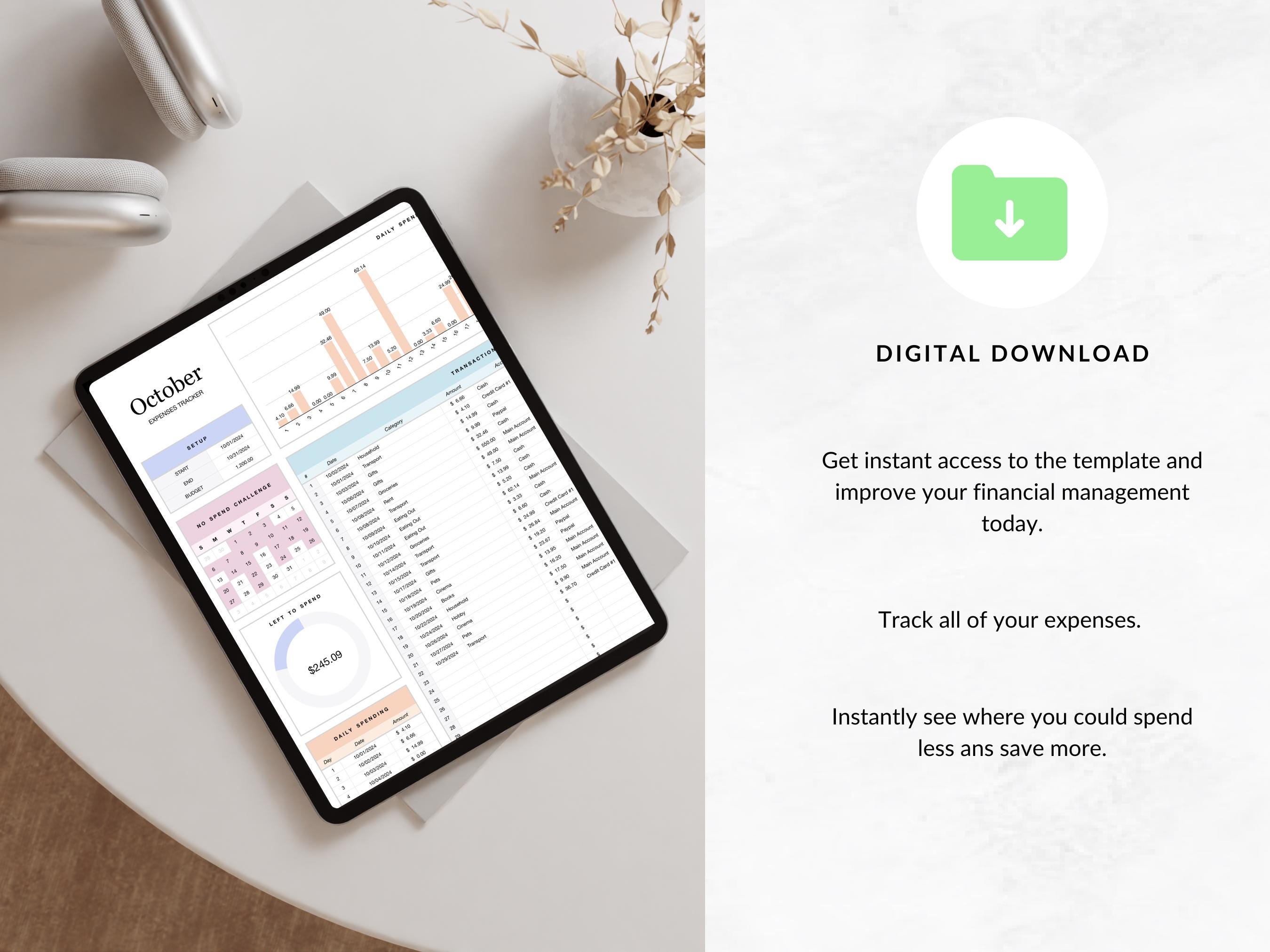 This budget table enables you to get a better overview of your where your money goes. The visually appealing spendings tracker makes your private accounting easier and helps you build wealth in the long term.