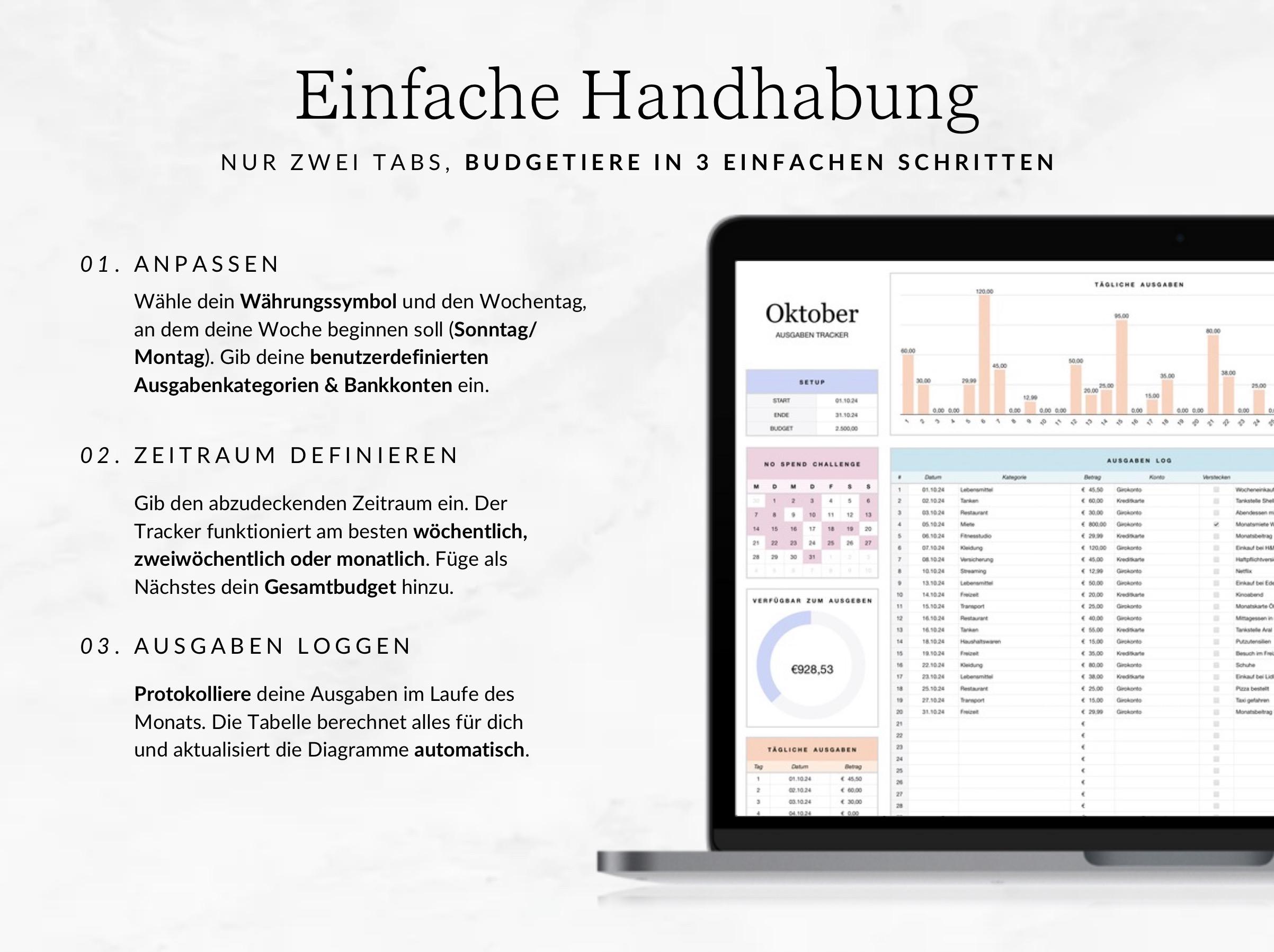 This budget table enables you to get a better overview of your where your money goes. The visually appealing spendings tracker makes your private accounting easier and helps you build wealth in the long term.