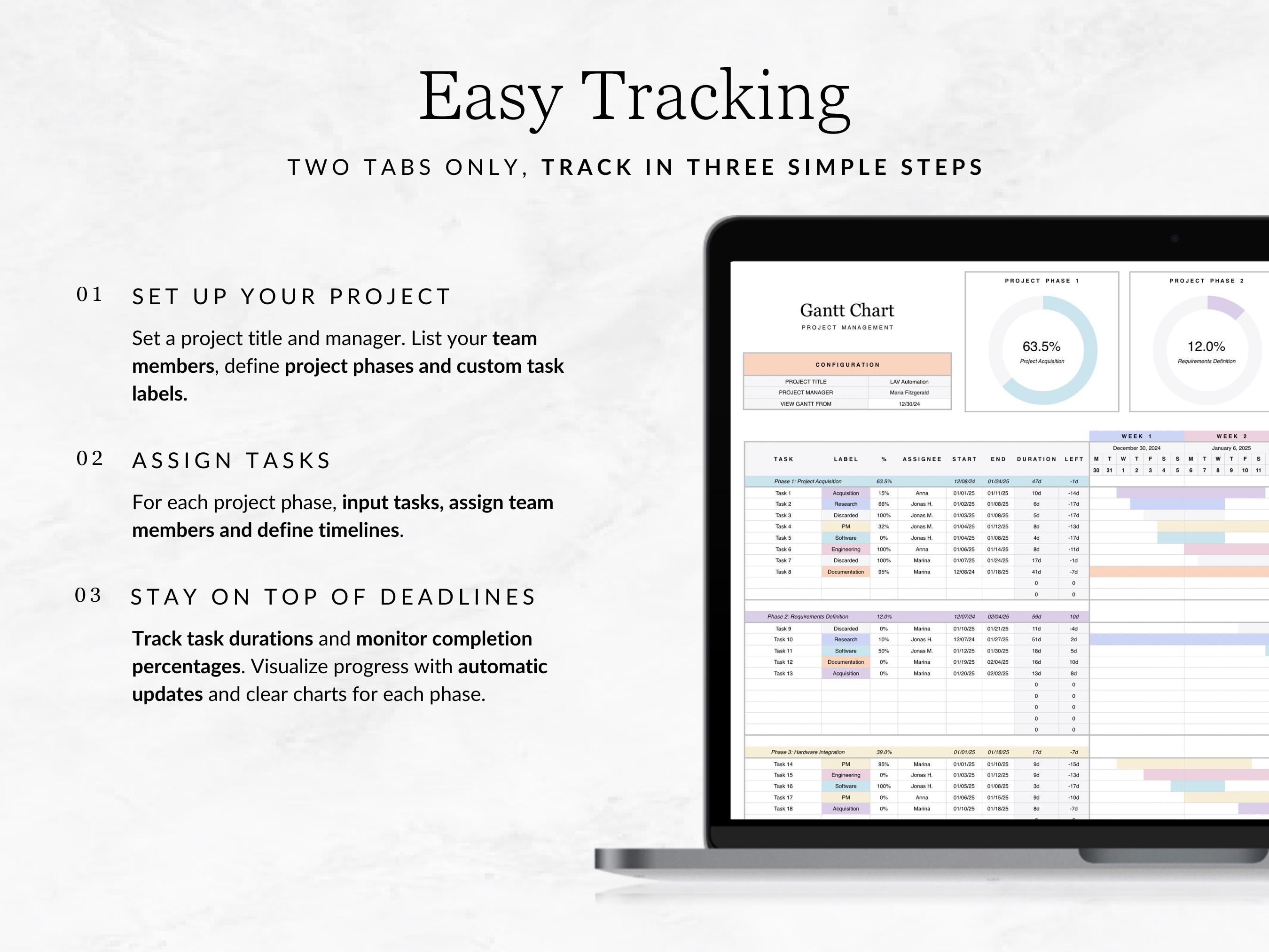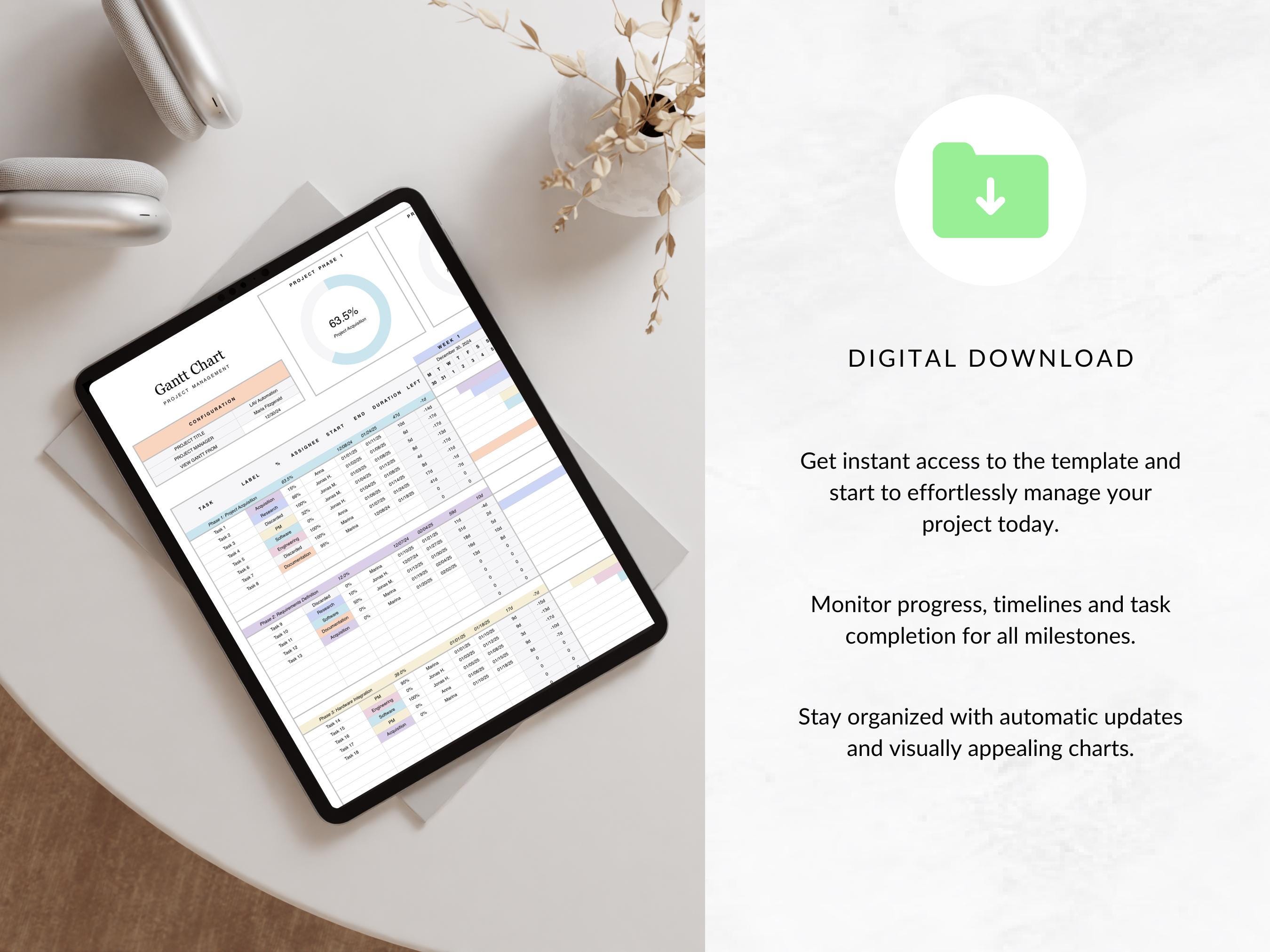 This spreadsheet gives you a better overview of your upcoming project milestones. The automatically generated Gantt chart helps you organizing your projects efficiently and makes your time management easier.